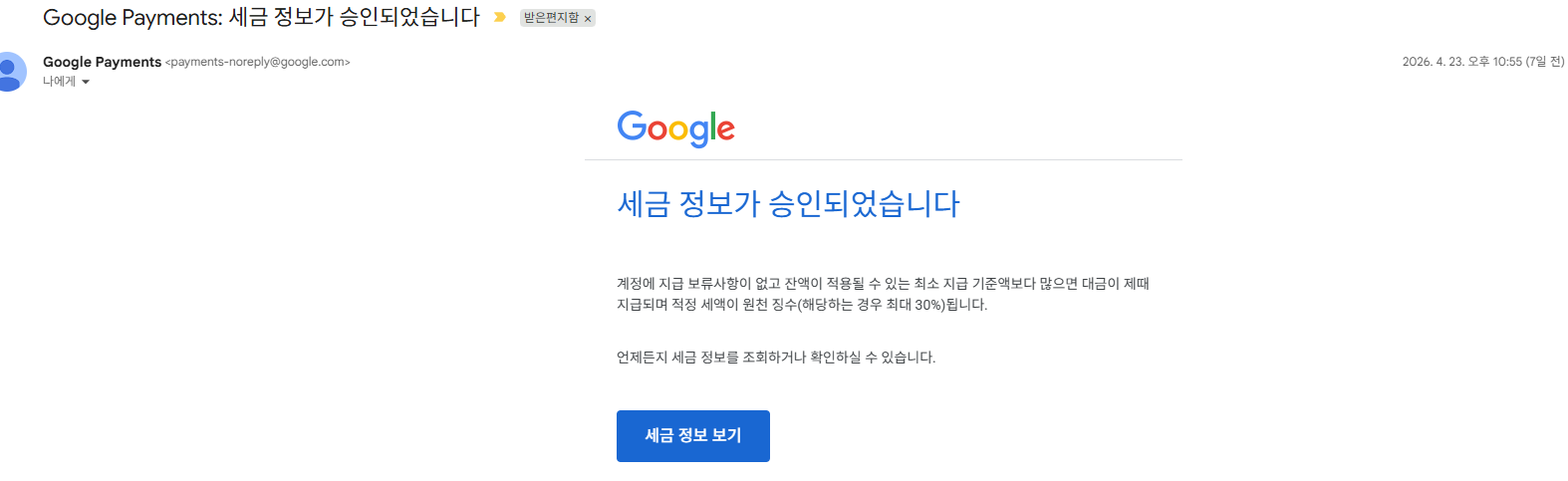 이제 승인 단계에 들어섰나요? 하지만 수익이 발생해도 세금 설정을 안 하면 미국 정부에서 수익의 30%를 원천징수해 갑니다. 이걸 막으려면 '조세 조약' 신청을 해야 해요. 아주 중요한 부분이니 천천히 따라오세요~